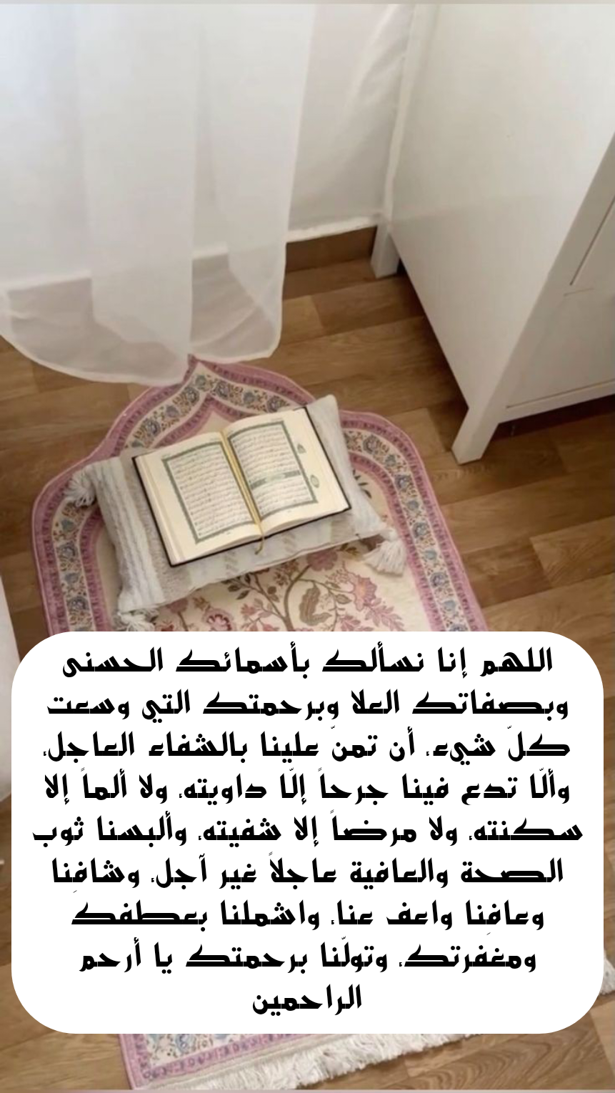 - اللهم يا من أسماؤك حسنى وصفاتك عليا يا من وسعت رحمتك كل شيء وعمّ لطفك كل الخلق نسألك يا رحيم أن تشافينا وتشافِ كل مريض وأن تجعل شفائنا سريعًا لا يطول به البلاء ولا يُثقل على النفس بالداء اللهم ألبس أرواحنا لباس العافية وأحِل أجسادنا بالصحة يا رب لا تدع ألمًا في أجسادنا إلا وقضيت عليه ولا مرضًا إلا وأزلته وأظلنا بحفظك ولطفك وحنانك يا أرحم الراحمين آمين.
