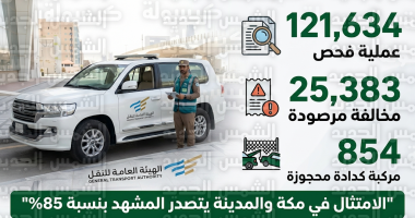 كشفت الهيئة العامة للنقل، اليوم الثلاثاء 3 مارس 2026 (الموافق 14 رمضان 1447هـ)، عن نتائج جولاتها الرقابية المكثفة المنفذة خلال الأسبوع الثاني من شهر رمضان المبارك، وتحديداً في الفترة من 5 إلى 11 رمضان، وأسفرت العمليات الميدانية عن فحص أكثر من 121 ألف وسيلة نقل لضمان أمن وسلامة ضيوف الرحمن والمستفيدين في مختلف مناطق المملكة.